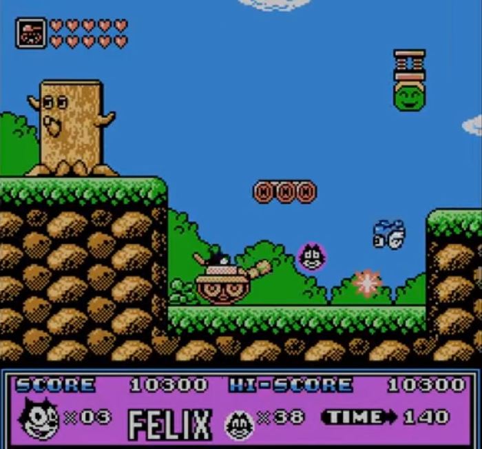 Кот феликс (Felix the cat) - моё мнение таково, что в этой игре вероятно самый разнообразный геймплей из тех, что я видел на Dendy. Играем мы за кота феликса, который обладает волшебной сумкой. Собирая портреты кота мы получаем сердечки, которые в свою очередь трансформируют сумку в разную технику и гаджеты. Например за всю игру нам удастся покататься на машине, танке, полетать на зонтике, воздушном шаре, самолёте, поплавать на лодке, дельфине, оседлать черепаху, управлять подводной лодкой и даже космическим кораблём. В игре есть 5 типов уровней с разной техникой и способом передвижения: сухопутный, воздушный, водный, подводный и космический. Всего в игре 9 миров с разнообразными врагами, а так же 8 оригинальных боссов. Ну скажите - разве эта игра не прелесть?