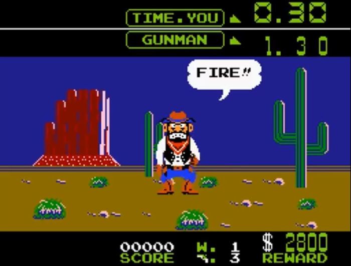 WILD GUNMAN - Дуэль на диком западе, стрельба по ковбоям и бандитам. Трудная игрушка, помню, когда попадали по ним - у кого-то падали штаны, у кого-то шляпа. А ещё эта игра была во второй части фильма «Назад в будущее». Помните момент, когда Марти Макфлай показывал юному Элайджа Вуду, как нужно стрелять из пистолета.