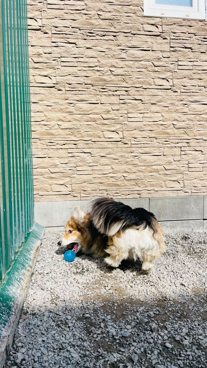 Он очень дружелюбный, активный, коммуникабельный парень. Очень любит играть с мячиком, и в этом даст фору многим молодым :)