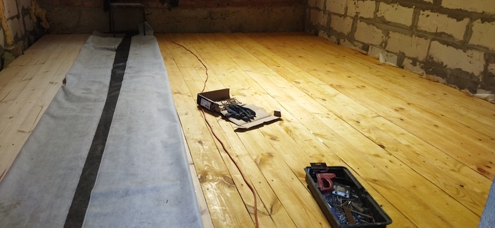 Кому интересно, что происходило внутри - дальше сделали тёплый контур (утепление, пароизоляция). Пароизоляция у нас традиционно, из многослойной плёнки 200 мкм с проклейкой всех стыков профессиональным скотчем Delta Multiband. Полы выполнены из шпунтованных плит Quick Deck, уложенных на обрешётку из доски 95х45.