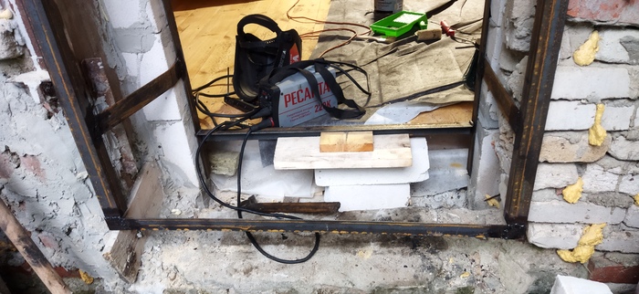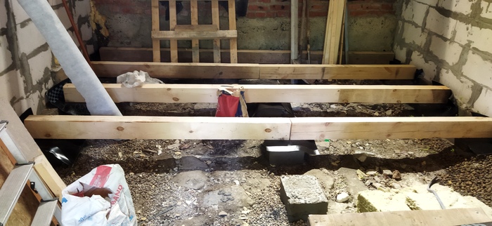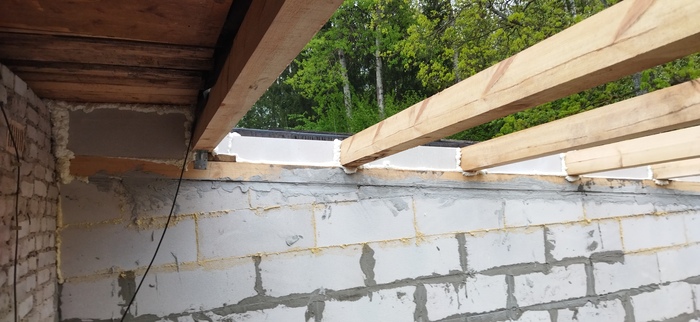 Собрали перекрытие. Видно, что дверной проём на пристройке у нас уменьшился. А ведь ещё предстоит собрать предчистовые полы, залить стяжку с тёплым полом и покрыть всё ламинатом. Высота будет ещё больше на 100 мм.