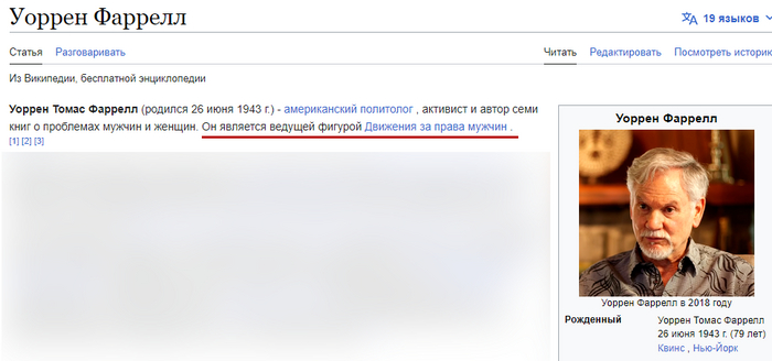 Я положил руку на сердце, когда узнал о существовании такого товарища как Уоррен Томас Фаррелл (Warren Thomas Farrell). Ведущая фигура Движения за права мужчин. Я посмотрел какие он книги написал, почитал про этого человека и что он говорит. Прочитал и про "Движение за права мужчин". Бальзам на душу, когда узнал, что всё же существуют большие сообщества, которые осознают невыгодное положение мужчин в современном социуме.