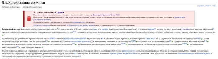 Забавно. Есть статья в Википедии "Дискриминация мужчин". Так вот на ней, на данный момент, вывешено предложение об удалении этой статьи. Все статьи, в которых описывается, якобы, дискриминация женщин, спокойно существуют на сайте, но когда увидели что-то про дискриминацию мужчин, так сразу на уши всех подняли и пытаются стереть любое упоминание подобного. Якобы "дискриминируют только женщин и поднятие темы про дискриминацию мужчин просто смехотворна и оскорбительна. Женщины бедные и страдают, а мужчины ещё имеют наглость жаловаться".