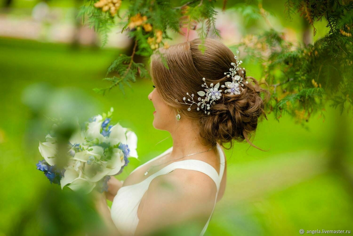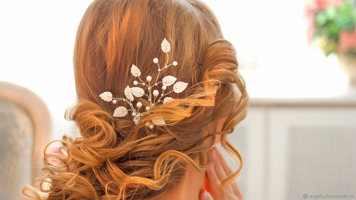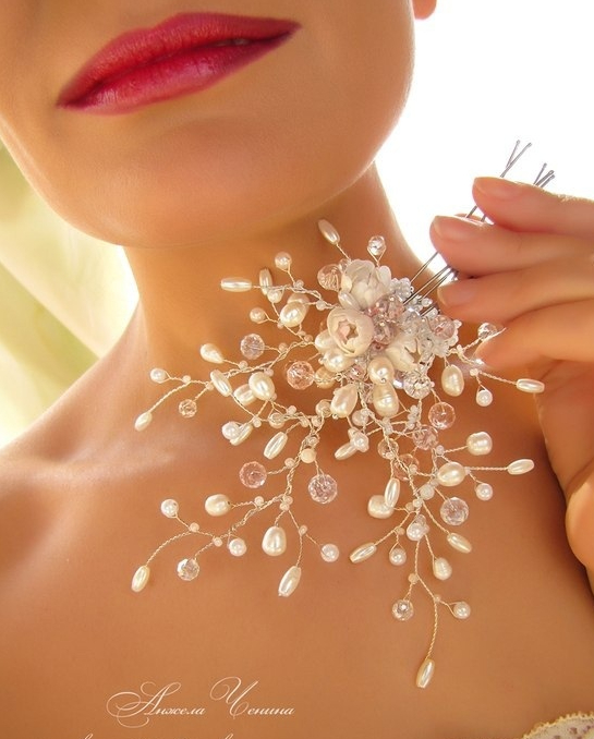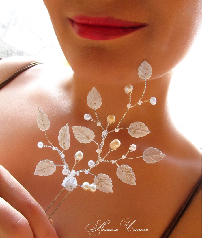 Все шпильки были сделаны на заказ ; все довольно простые в исполнении - методика "скруток"; материалы - жемчуг и бусины под жемчуг, ювелирная посеребренная проволока, цветы и листья из полимерной глины, или из фоамирана.