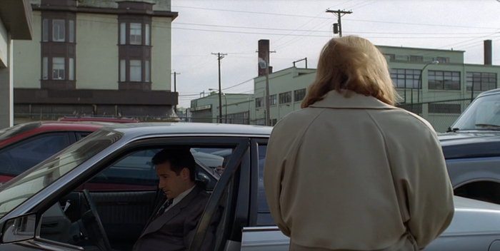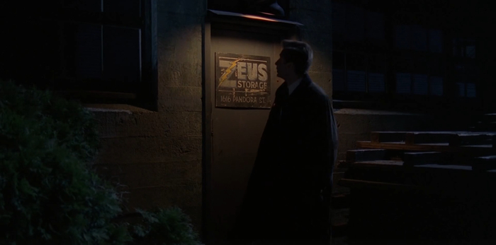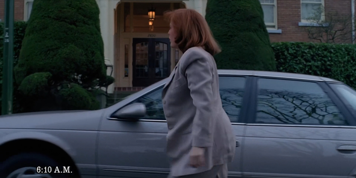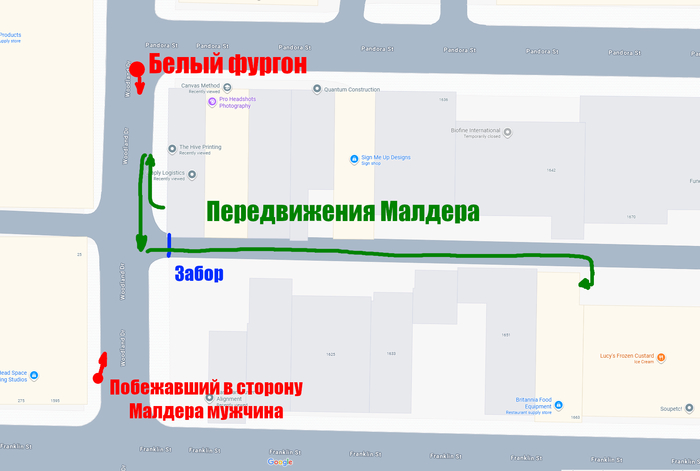 После того, как Малдер вышел со склада, он пошёл на север вдоль Woodland Drive в сторону пересечения Woodland Drive и Pandora Street, но увидел, что к зданию подъезжает белый фургон. Малдер развернулся на юг в сторону пересечения Woodland Drive и Franklin Street, но увидел, что в его сторону побежал какой-то мужчина в костюме. Далее Малдер повернул на восток в безымянный проезд, перепрыгнул через забор и пробежал настоящие 100 метров, укрывшись за углом.