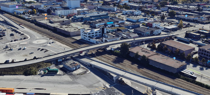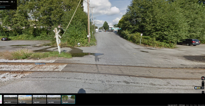 Снято на эстакаде через железнодорожные пути на улице Clarke Drive в районе ванкуверского глубоководного морского порта.