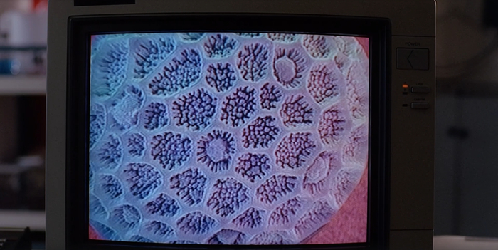 На мониторе в лаборатории, куда Скалли отнесла данную колбу, отображается такая вот картинка, и женщина-учёный говорит, что это бактерия: