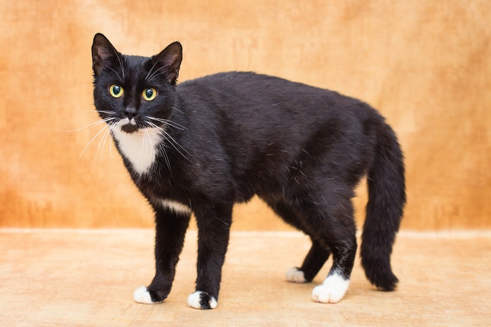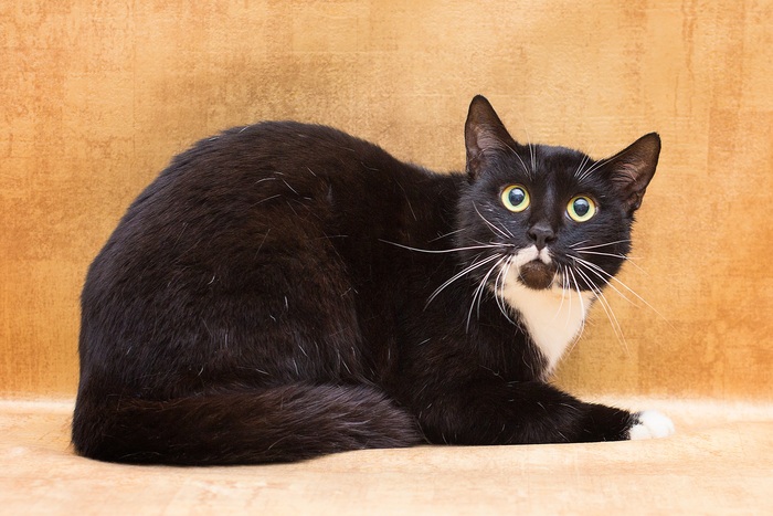 Черная кошечка с беленьким усиком мечтает о доме и любящей семье