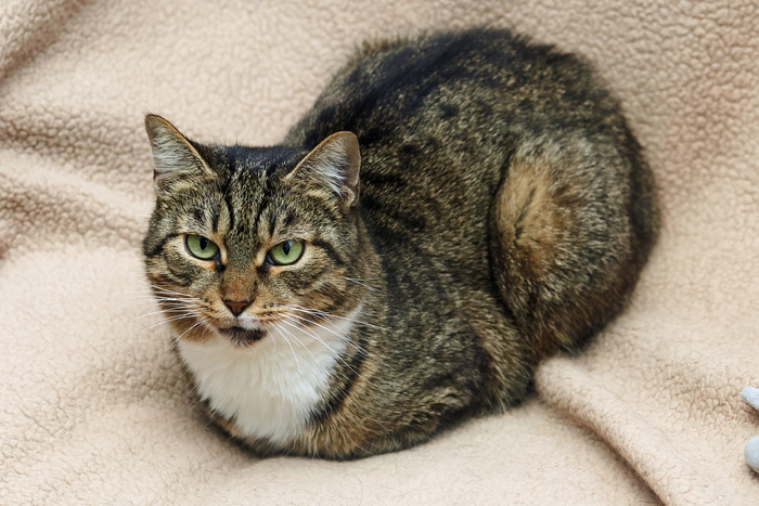 Кошечке около годика, может, чуть больше. Она в стрессе, напугана, очень худенькая — видно, что недоедала. Но при этом девочка невероятно ласковая и тянется к человеку.