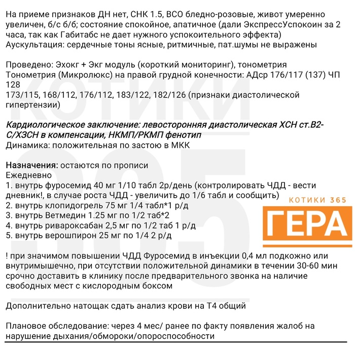 Ветмедин 1.25 мг по 1/2 таб*2, ривароксабан 2,5 мг по 1/2 таб 1 р/д, верошпирон 25 мг по 1/4 2 р/д +В12 .