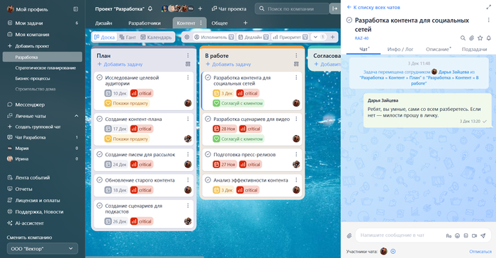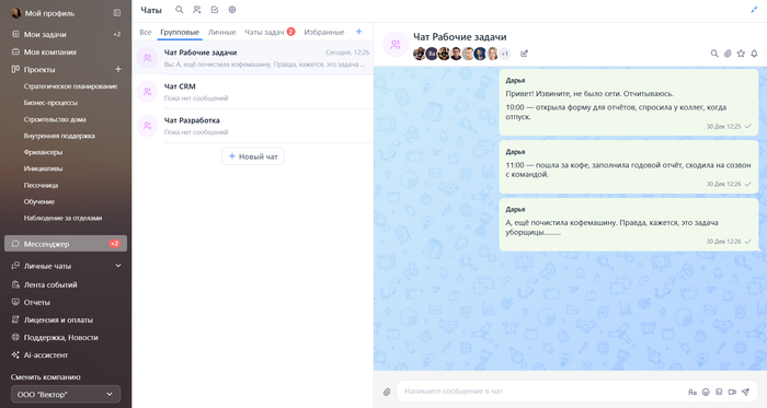 Работайте в мессенджере, команда и так сидит в нём почти всё время. Так коллеги точно увидят ваши срочные сообщения в 23:35. А в трекер заходите раз в неделю: заносите туда задачи «для галочки», чтобы видеть цифры, статусы и отчётность.