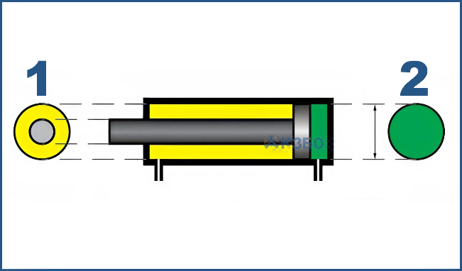 На схеме выше показано, что ЭППГ поршневой (зеленой) полости больше, чем у штоковой (жёлтой) полости. Серым цветом отмечен сам шток.