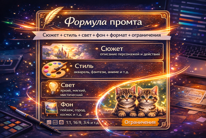 Сюжет + стиль + настроение/свет + фон + композиция + формат + ограничения