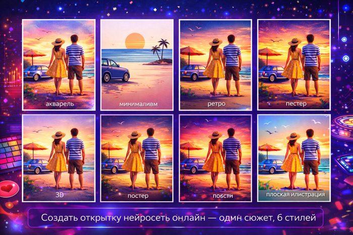 Выбирайте подход "один сюжет - разные стили". Тогда легко создать картинку нейросеть онлайн серией: день рождения, 8 Марта, Новый год.