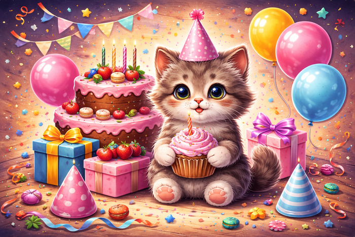"Веселая открытка на день рождения. Главный объект: смешной кот в праздничном колпаке, держит маленький шарик. Стиль: яркая мульт-иллюстрация, чистые контуры. Настроение радостное, динамичное. Фон простой, без перегруза. Композиция по центру. Формат 4:5. Без текста, без логотипов, без водяных знаков."