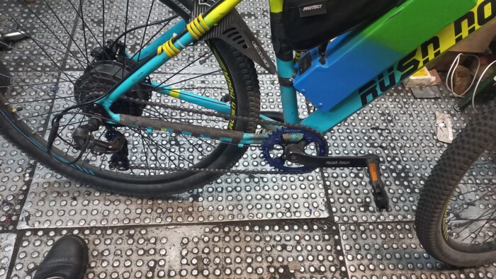 Недавно приехала передняя звезда, и три звезды спереди были заменены на одну с разношироким зубом. Забыл добавить,что мотор колесо уже на кассете, так что теперь у меня всего 7 передач, чего просто заглаза с такими мощностями.