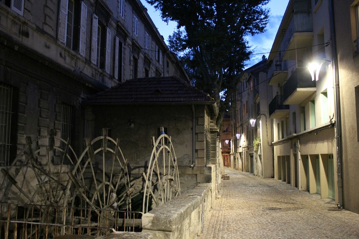Помимо природных красот и именитых "гостей" Авиньону повезло и с географией: рядом с городом протекают три крупные реки (Рона, Сорг и Дюранс). А это - зелёный свет для торговли, культуры и промышленности. На улице Красильщиков до сих пор можно полюбоваться на водяные мельницы, которые запускали ткацкие станки. Целая мануфактурная улица: 23 колеса (хотя до наших дней дожили только 4). Здесь производили шелк, шерсть, бархат и отбеливали индийский хлопок.