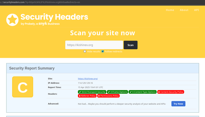 Сайт получает оценку C - не критично, но у нас (WHM) все сайты получают A+ по умолчанию, без дополнительной настройки.
