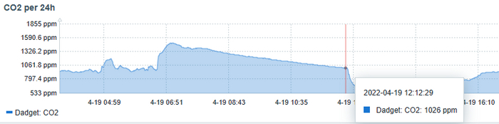 ...на улице начался ветер, все окна были закрыты полностью. Уровень СО2 ожидаемо рванул вверх вплоть до почти 1900 ppm: