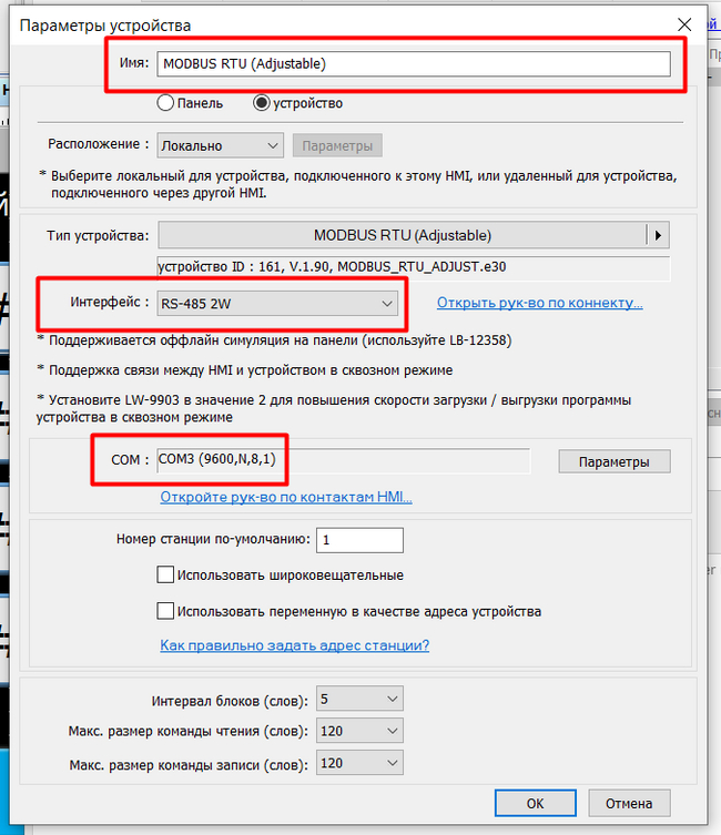 Выбираем Modbus(Adjustable). Настраиваем интерфейс RS-485, (настройки связи, COM, скорость и т.д.) Жмём ОК.