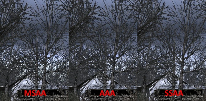 Так как ни одно из сглаживаний, основанных на множественной выборке, не может справиться с прозрачными текстурами, в середине нулевых обе компании добавили в драйверы для видеокарт еще один метод сглаживания. Он имеет гибридный подход, который может справиться со сглаживанием прозрачных текстур, но при этом не так тяжел, как чистый SSAA. Это — Adaptive Anti-Aliasing (AAA) у AMD и Transparency Anti-Aliasing (TrAA) у NVIDIA.