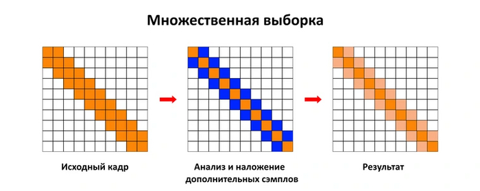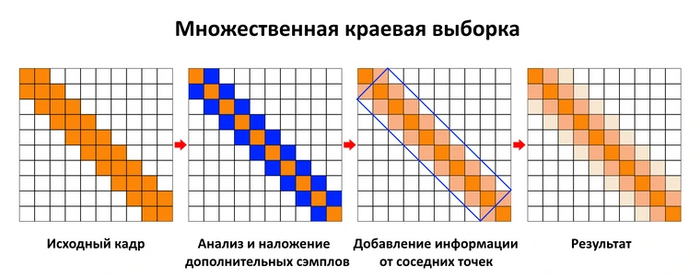 С этим призвано бороться сглаживание. Несмотря на огромное количество его видов, основной принцип работы любого сглаживания, за исключением основанных на постобработке, прост: чтобы убрать искажения, для каждой точки на итоговой картинке просчитывается несколько точек, называемых сэмплами. Затем сэмплы объединяются и смешиваются, образуя итоговый цвет целевой точки. Количество сэмплов определяет уровень сглаживания, которое всегда кратно двум — 2x, 4x, и так далее.