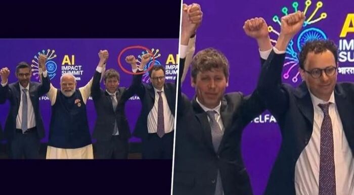 Моди пытался устроить милый момент. Он хотел, чтобы все на сцене взялись за руки в символическом жесте единства, типа "мы все вместе строим будущее". Большинство послушно взялись за руки, а вот Сэм Альтман (OpenAI) и Дарио Амодей (Anthropic), стоявшие бок о бок — нет. Они просто подняли кулаки вверх, и выглядело это максимально неловко: Сэм отводил взгляд, Дарио стоял как вкопанный. Видео моментально разлетелось по X, Instagram и новостям.