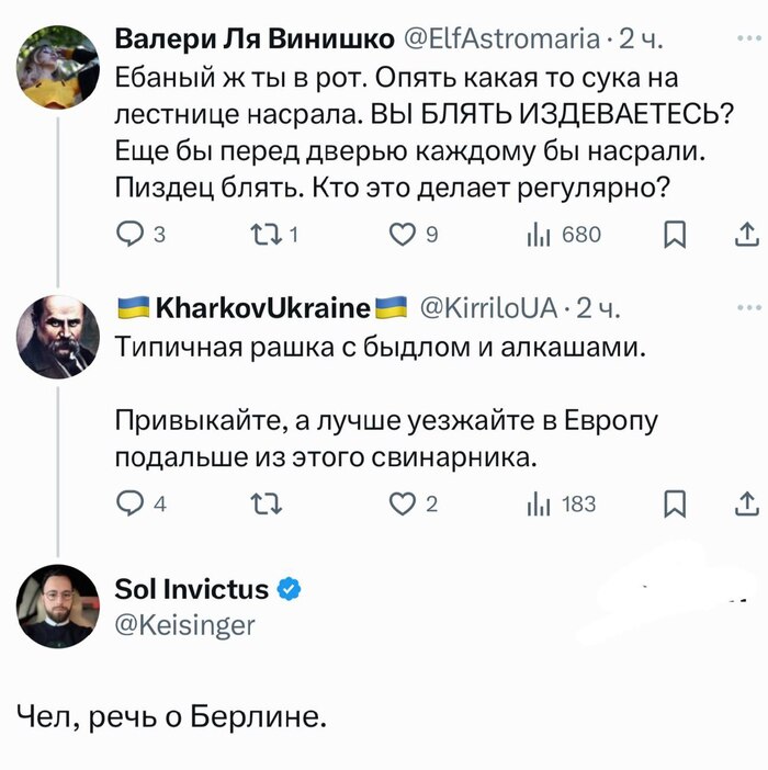 Более 2000* человек вышли к Берлинской опере с лозунгом «Войны - больше никогда». Они требуют от властей дипломатии, а не поставок оружия Украине с Израилем и размещения американских ракет в Германии. Протестующие прямо заявили: теория о «российской угрозе» - это ложь, чтобы оправдать милитаризацию. Их плакаты говорят сами за себя: «Так называемое объединение [ГДР и ФРГ] - вторая по масштабу ошибка в немецкой истории». На баннерах напомнили о «предательстве Горбачёва» - том самом обещании Запада не расширять НАТО на восток в обмен на объединение Германии, которое Запад цинично нарушил.