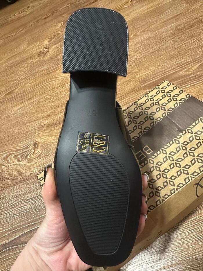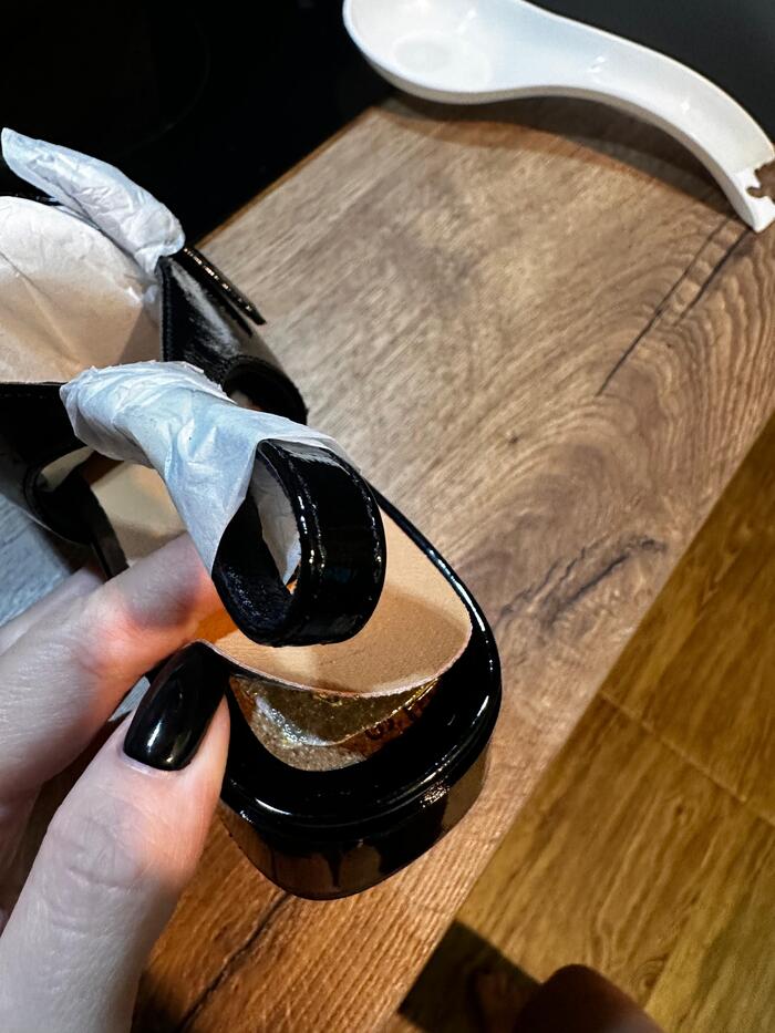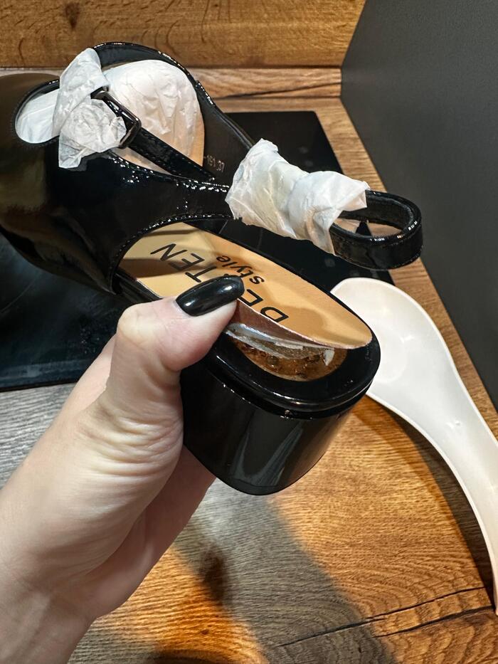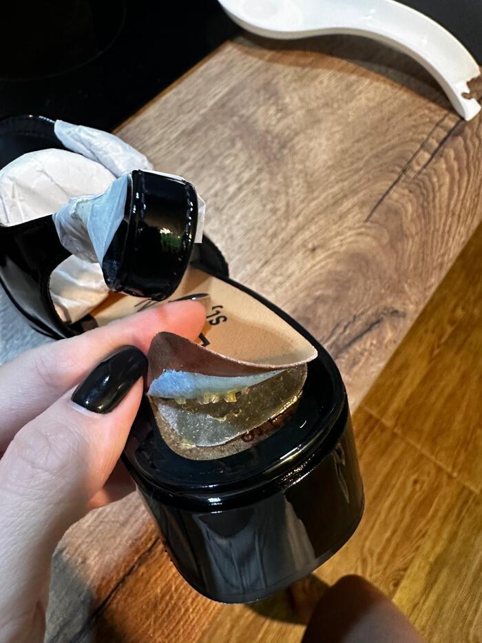 По итогу курьер приносит пакет, мы его забираем, жена начинает смотреть вещи, а там два испорченных товара, об одном из них и пойдет речь. Обе черевички с отклеенными стельками.