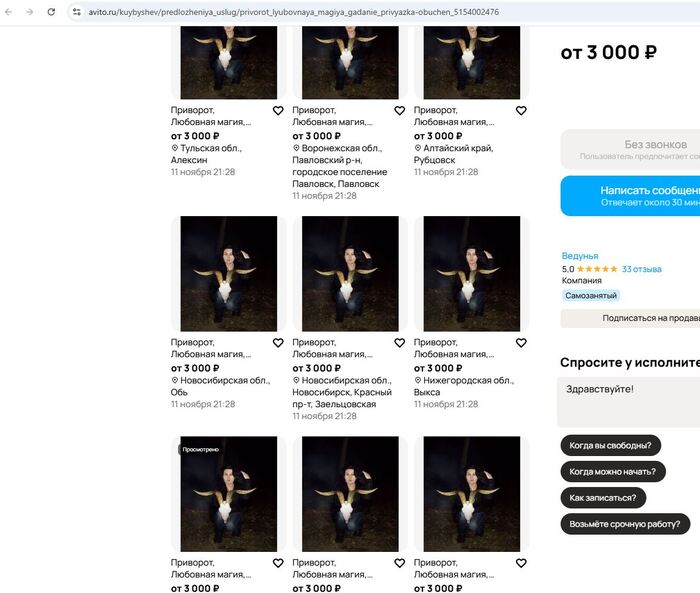 Давно перестал пользоваться данной площадкой как продавец (скатилось в помойку, жадность площадки, тупость поддержки и тп.), но иногда захожу почекать обьявления по городу. Встречал много всякого скама, который дублируется обьявлениями по всей стране, вроде "мастер на час" или "ремонт ПК за вашу двушку в Кемерово". И как бы сам авито с этим никак не борется, что ж понимаю- все любят деньги. Но сегодня наткнулся просто на новый уровень звездеца творящегося в этом болоте алчности.. Масштабы конечно впечатляют, самое забавное что подобные "услуги" запрещены правилами самого Авито, но никак не модерируются. Или если документы подтверждены через Госуслуги, то это уже не мошенники, а предприниматели🤔