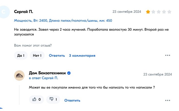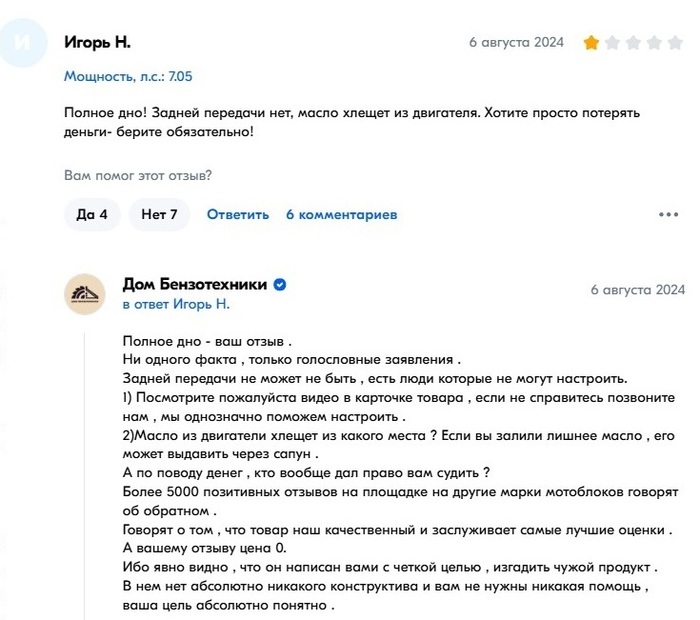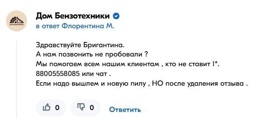 Читал отзывы на озоне. Наткнулся на ООО ОБЩЕСТВО С ОГРАНИЧЕННОЙ ОТВЕТСТВЕННОСТЬЮ "ДОМ БЕНЗОТЕХНИКИ". В комментах их сотрудник буллит покупателей за отрицательные отзывы на свой товар, шантажирует и требует удалить отзывы. Просто оцените это днище.