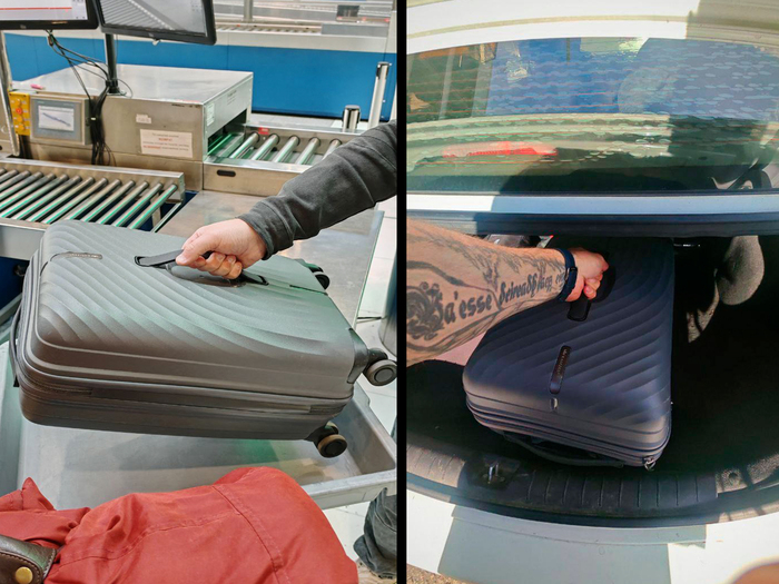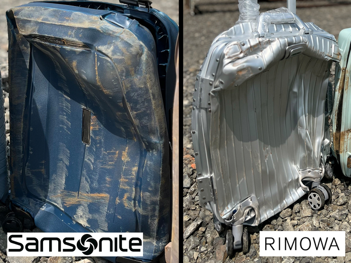 В том же тесте Samsonite потрескался и перестал закрываться из-за сломанного замка, а колесики отвалились. Rimowa же просто превратился в лист алюминия – в принципе, если протекает крыша в сарае, пригодится.