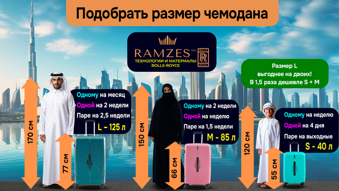 Вещей в дубайский чемодан S влезет не очень много: мужчине хватит на неделю, женщине – на 4 дня, а паре – на выходные. То есть подходит для командировки или короткого отдыха. А потом даже показал вот такую специальную памятку по выбору размера чемоданов, которую мы сделали для покупателей дубайских чемоданов (но классификация эта общепринятая для любых брендов).