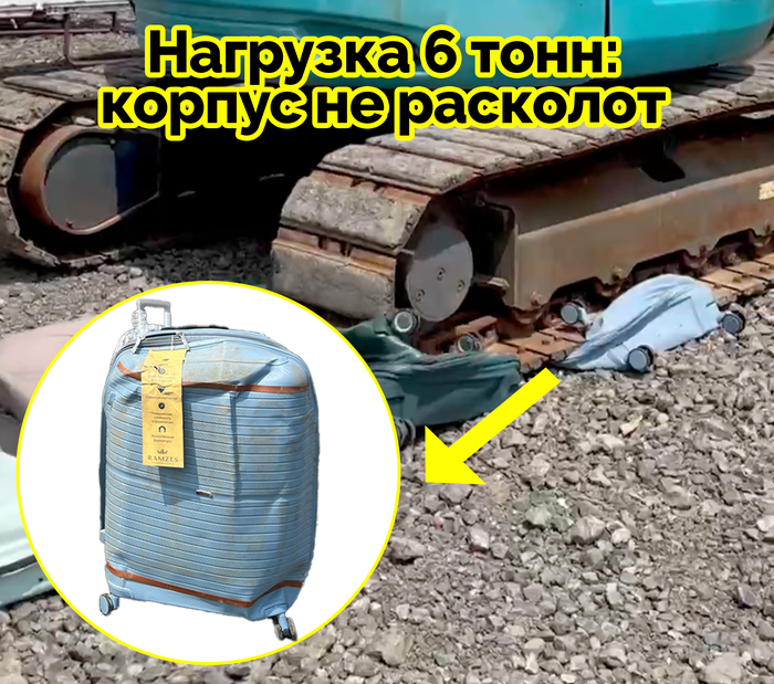 Мы даже провели наглядный эксперимент, чтобы сравнить прочность популярных в России чемоданов. В ходе испытания по ним несколько раз проехал тяжеленный 6-тонный экскаватор. У дубайского чемодана корпус сильно помялся, но не раскололся и не потрескался. Так что форму поправили и хоть завтра с вещами – на вылет!