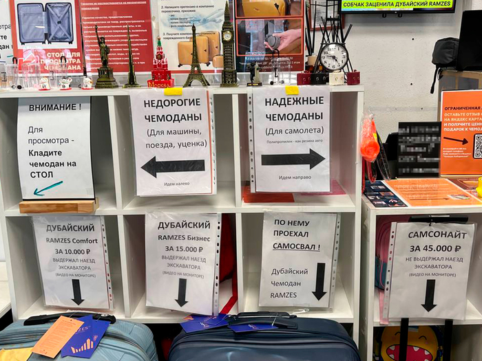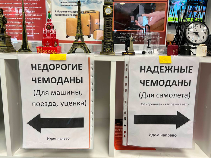 Менеджер сразу объяснил, что само ТЗ покупателя сформулировано некорректно. Тканевые чемоданы и перелеты не мэтчатся точно так же, как эскортницы из Маскоу-Сити и «Рено Логан». А главное – на самом видном месте в магазине для таких «особо одаренных» посетителей висит специальная подсказка.
