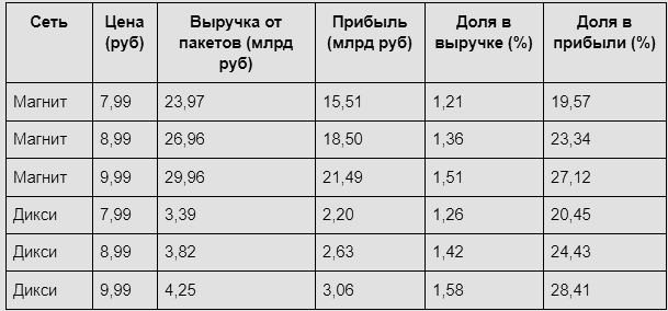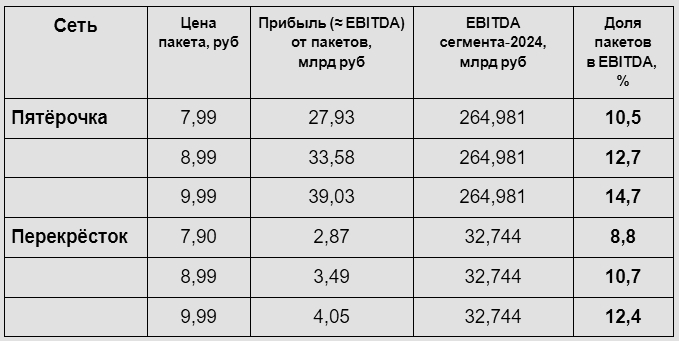 Всего же, по моим оценкам, Пятерочка заработала на пакетах около 39 млрд рублей, а Перекресток — около 4 млрд.