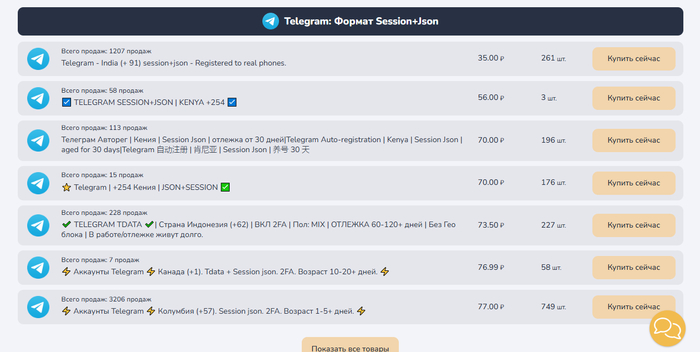 База аккаунтов в формате Tdata, Session+Json + каналы. Найдите интересующий вас вариант, воспользовавшись фильтрами по стоимости и формату. Список вы можете отсортировать для удобства навигации: по количеству продаваемых аккаунтов, цене, названию, общим продажам. В названии предлагаемого варианта сразу видно гео и некоторые другие подробности: например, возраст аккаунта, пол, включена ли 2FA.
