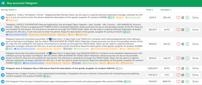 Сервис разделяет предложения продавцов на несколько категорий: Tdata, Session, «Возрастные», каналы, группы и так далее. Можно купить аккаунт Телеграмм с разной датой создания, геолокацией, уровнем защиты и прочими параметрами. Для каждого тарифа представлено подробное описание. После оплаты будет около часа для проверки, время может отличаться в зависимости от условий владельца.