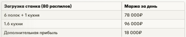 Получается, используя станок только для кухонь, можно заработать на 18 000₽ в день больше. И это без дополнительных вложений — просто по-другому используя то же самое "бутылочное горлышко".