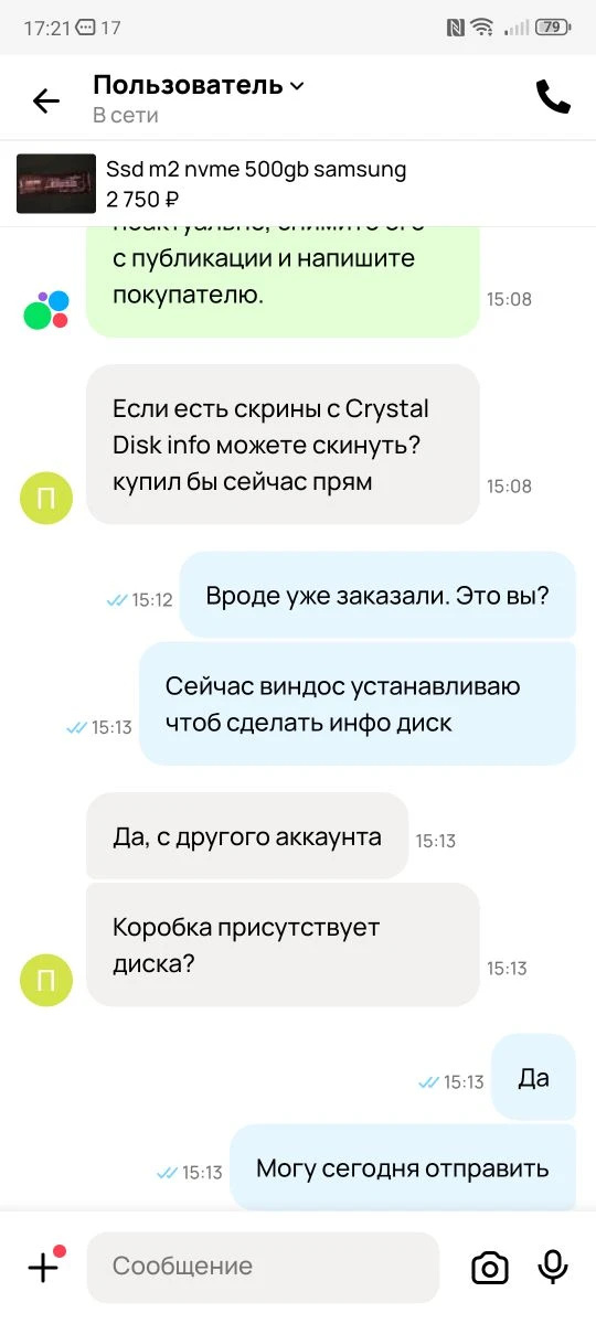 Редко продаю что-то на «Авито», но тут решил продать свой старенький NVME. Решил продать по низу рынка, так как были нужны деньги. Даже доставкой я готов ждать, время позволяло и меня всё устраивало. Деньги нужны на НГ. И стал ждать. Не проходит и 1 минуты, как пишет данный Пользователь, вернее, не пишет, а сразу заказывает. И говорит: «Сможете отправить как можно быстрее?» Я говорю: «Могу», взял SSD и поехал на почту, благо мне до неё 10 минут езды на маршрутке.