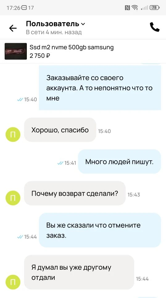Так вот, активный покупатель, который моментально хотел купить мой SSD, оказался очень непорядочным человеком. Я потратил время, деньги на маршарутку... ради НИЧЕГО. Ну почти, получил опыт. И да, как я уже писал выше, я бы не отправил этому мутному типу, но я знаю, что он у меня заказал, + всёл переписку, что он, если я откажу, он мне просто поставит 1 звезду.