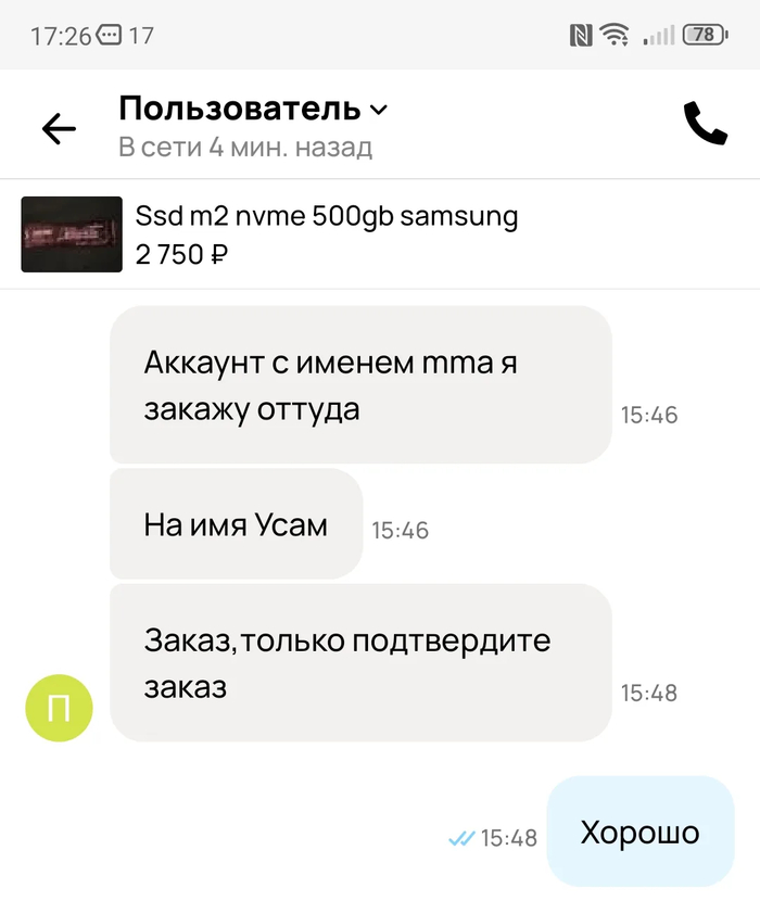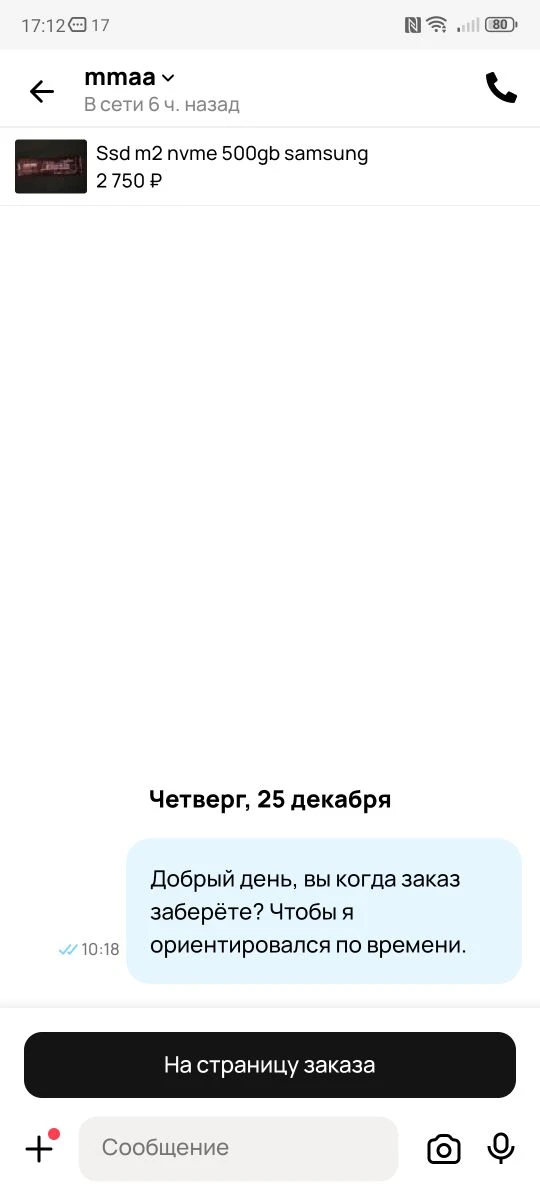 После этого пользователь заказывает мой SSD с аккаунта mma. Если честно, не хотелось уже даже общаться и просто сказать что-то по типу: «Мне человек из моего города написал, ему продам и т. д., т. п., извините». Но я знаю, что он мне имеет уже право поставить 1 звезду. И вот только из-за этого отправляю.