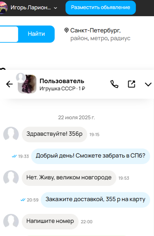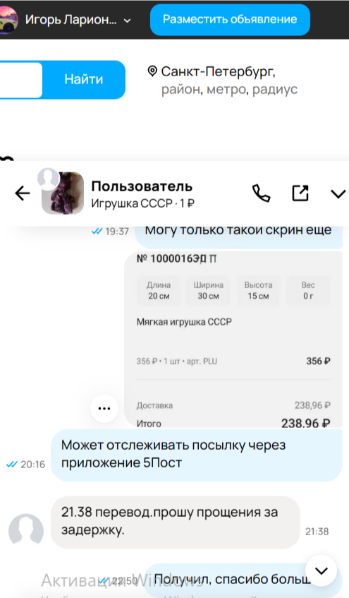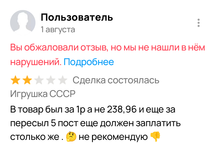 Уже более года пользуюсь Авито как площадкой для продажи своих личных ненужных вещей. Цели как-то обогатиться или заработать гору денег никогда не было. Обманом тем более никогда не занимался, характер у меня далеко не барыги. Так вот, ещё летом произошла со мной такая ситуация: выставил на продажу лот старых советских вещей (кукол, игрушек и ещё какой-то мелочи из кладовки). Через время куклы были проданы, осталась какая-то старая игрушка - решил ее выставить с ценой 1 рубль с формулировкой "цена договорная". Пишет мне мадам с предложением купить эту игрушку за 328 рублей. Обсуждаем все детали, договариваемся на доставку через 5 Пост. Я отправляю скрин, что посылку отправил с указанием цены доставки, она начинает ожидать. Через время мне эта мадам начинает писать в стиле "я заплатила за доставку при получении, верните мне деньги". Я недоумеваю, пытаюсь объяснить, что я тут не причем, доставка была платной и вам было это продемонстрировано + очевидно, что можно было просто не забирать посылку, если что-то не устраивает.Мягко посылаю мадам в дальнее пешее и ещё повторяю, что ничего возвращать не собираюсь. Почти сразу прилетает отзыв ,что я обманул с ценой бедную покупательницу (все скрины прикреплю ниже). Несколько раз пытался обжаловать этот отзыв, так как рейтинг он мне неплохо так подпортил, но Авито как всегда "нарушений в отзыве не нашли" и оставили этот отзыв в профиле. В очередной раз Авито защищает халявщиков и прохиндеев. Не буду кидаться грязью и обвинять Авито во всех смертных грехах - площадка имеет много минусов, но аналогов практически нет, да и все пока что нет столь безнадежно.