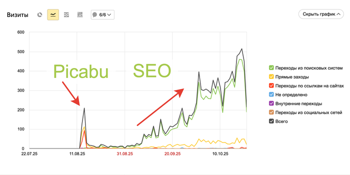Рост брендовых запросов — оценить эффективность можно в Вордстате, сравнивая от месяца к месяцу количество брендовых запросов в поиске Яндекса.