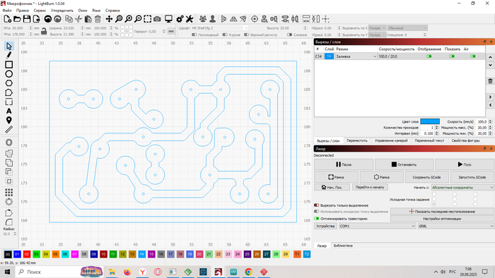 В архиве так же будет лежать файл Light Burn, что бы можно было плату сделать на диодном лазерном станке, дорожки оптимизированы под станок. Для это необходимо покрасить поверхность фольгированного текстолита, высушить, сжечь лазером лишнюю краску, оставив дорожки, сделать травление платы любым доступным способом, смыть краску с дорожек растворителем 646.