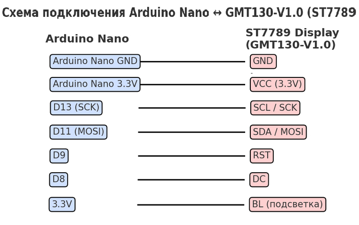 Модуль (GMT130)Arduino NanoGNDGNDVCC (или 3.3V)3.3V (на Nano или отдельный стабилизатор)SCL / SCKD13 (SCK)SDA / MOSID11 (MOSI)RSTD9 (пример) — можно и к RESET модуля напрямуюDC (или D/C)D8 (пример)BL / LED / BCK3.3V (через транзистор/резистор) или Arduino D3 для ШИМ