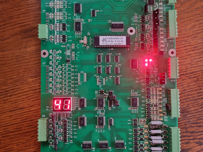 Подаём питание. Загораются светодиоды, индикатор показывает FF 41. FF здесь — неизвестное положение кабины, 41 — отсутствие напряжения 24 В. Отлично, плата работает.