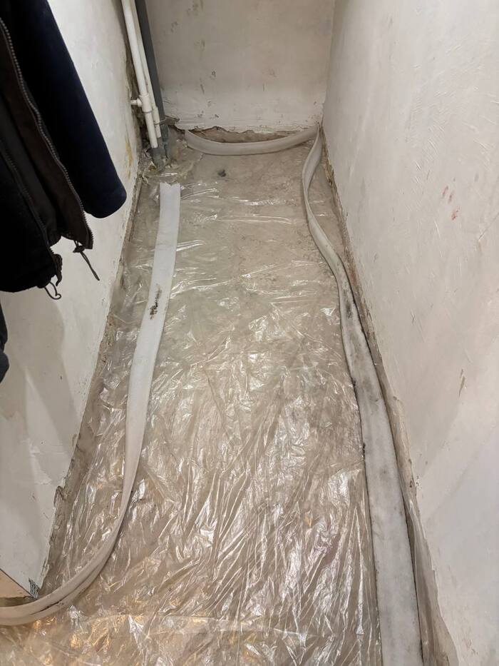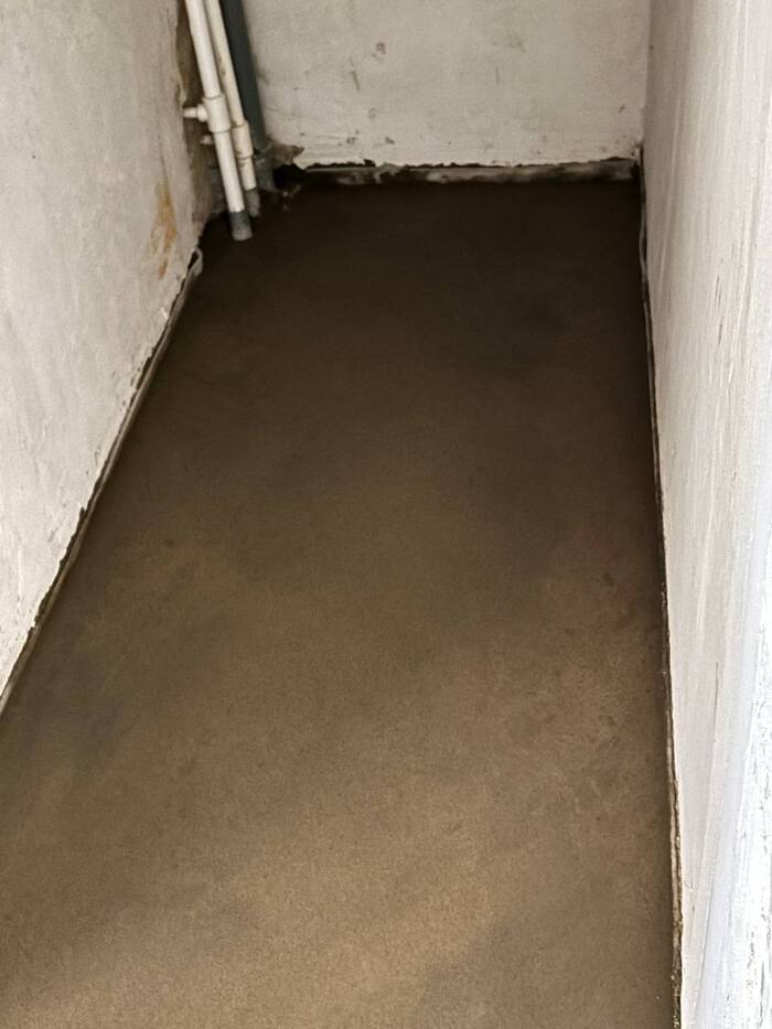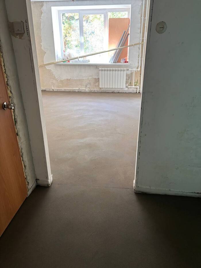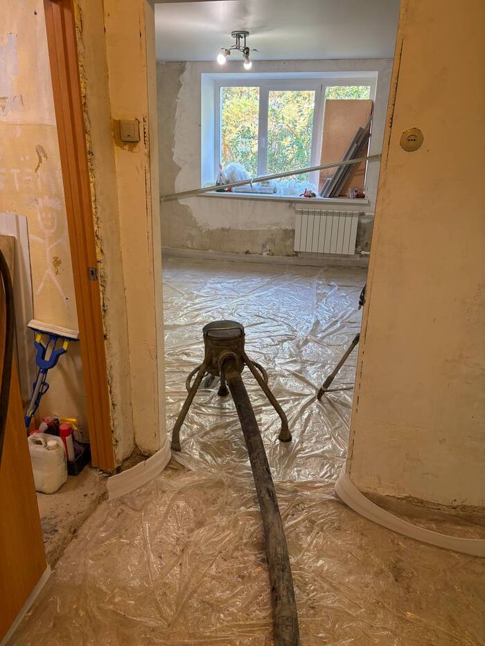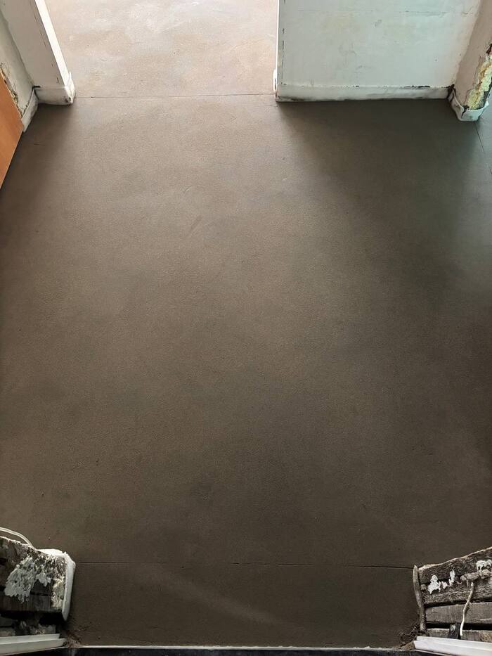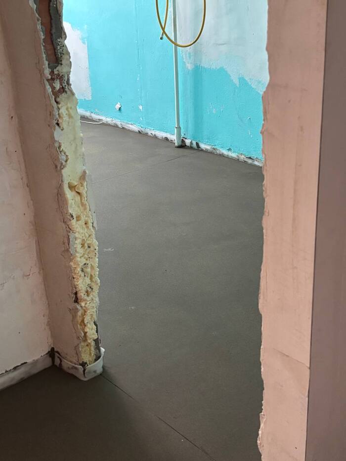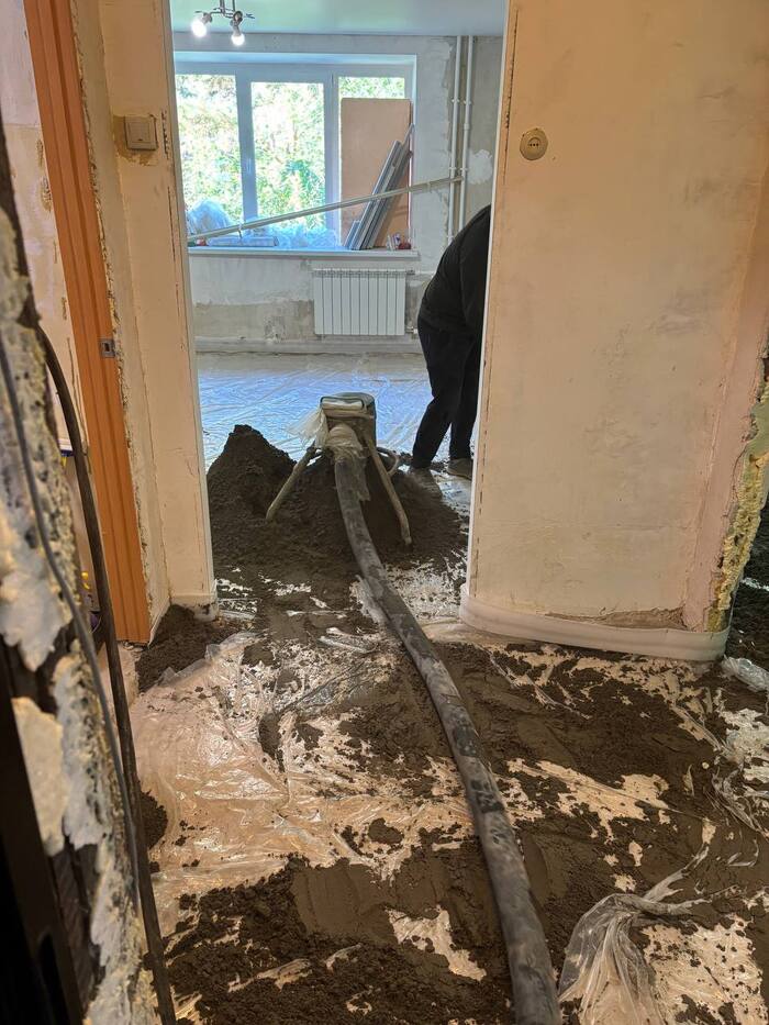 Смесь подавали прямо с улицы через бетононасос — это ускоряет процесс и избавляет от грязи в квартире и подъезде. В раствор добавили фиброволокно — оно повышает прочность и устойчивость к растрескиванию.