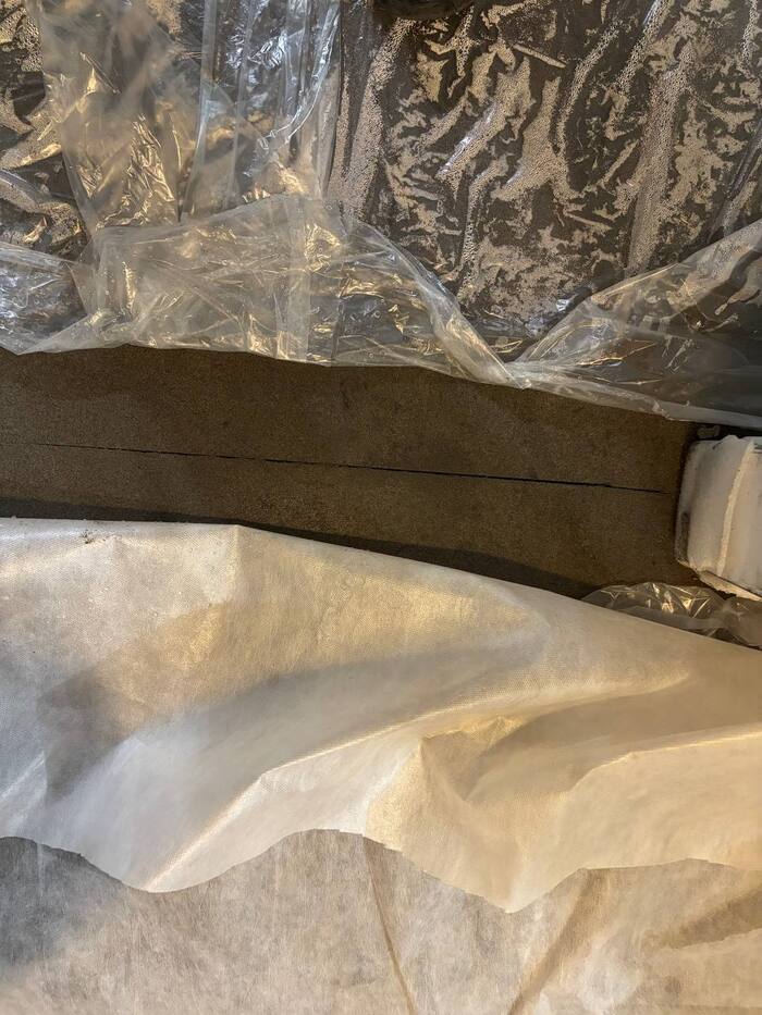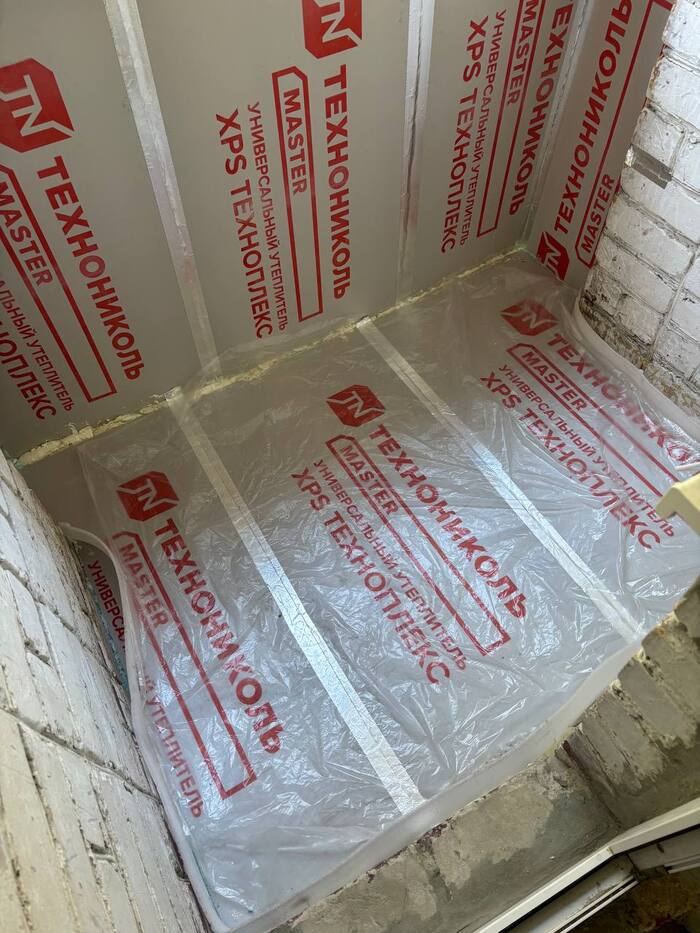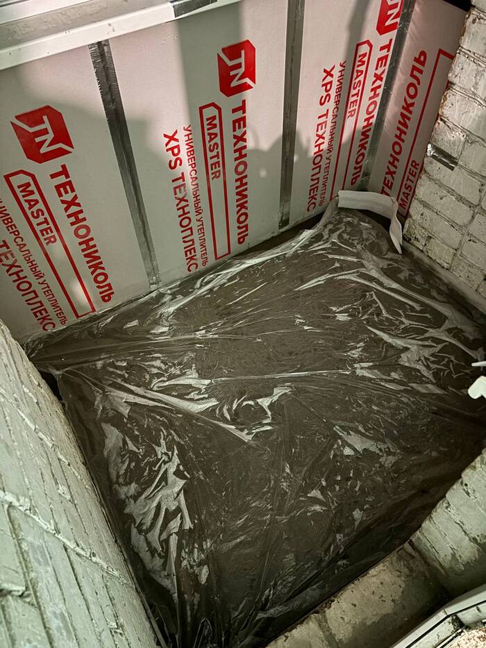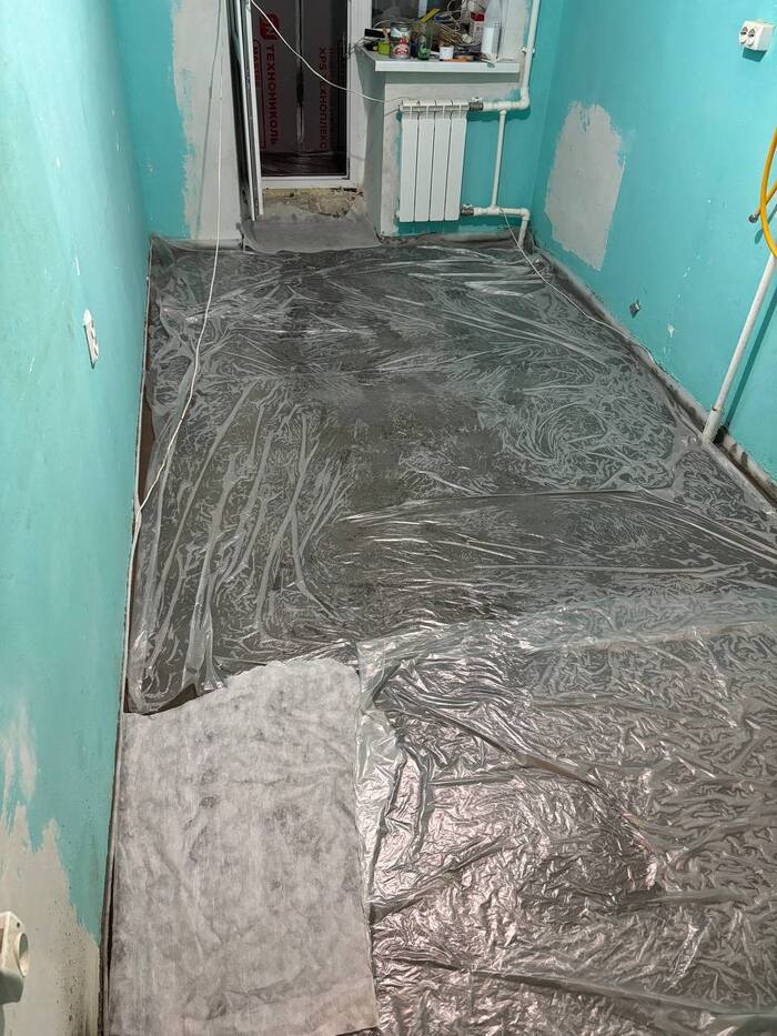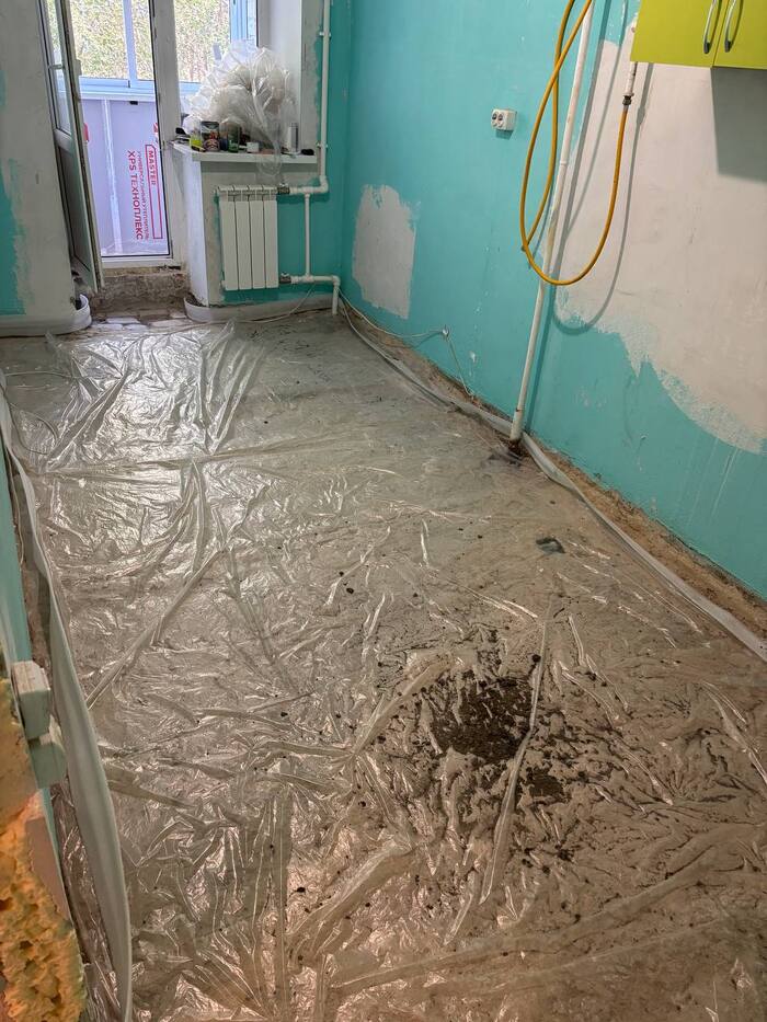 Сначала по всей площади постелили полиэтиленовую плёнку — она выполняет роль гидроизоляции и подложки. По периметру стен установили демпферную ленту — это компенсирует расширение стяжки и предотвращает появление трещин.