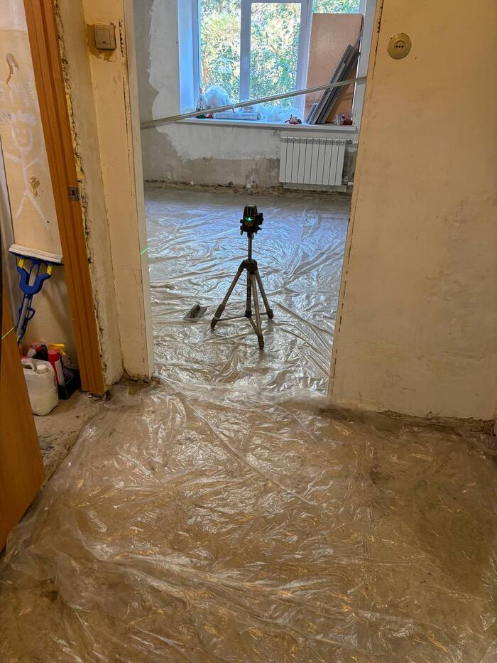 С помощью лазерного уровня сделали точную разметку уровня пола. Это важно, чтобы стяжка получилась ровной, без перепадов.